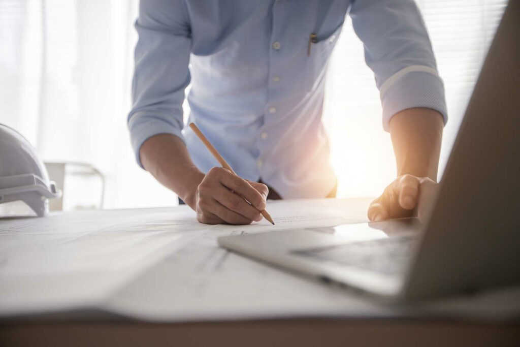 Architect working in office with blueprints,engineer thinking and planning inspection in workplace for architectural plan,sketching a construction project,Business construction concept